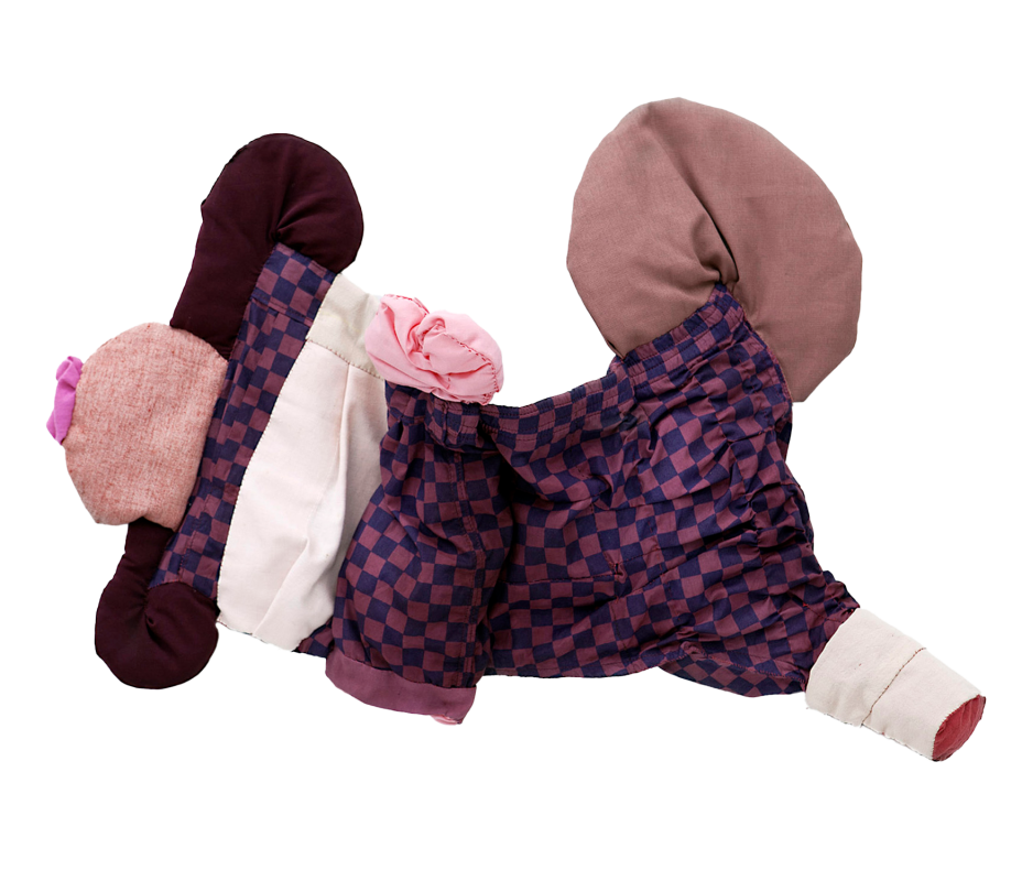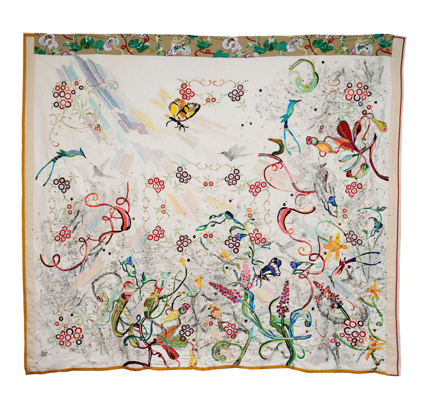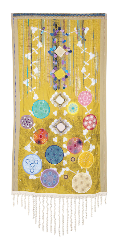 Embroidery on fabric, ñandutí, ribbons, and charcoal drawing