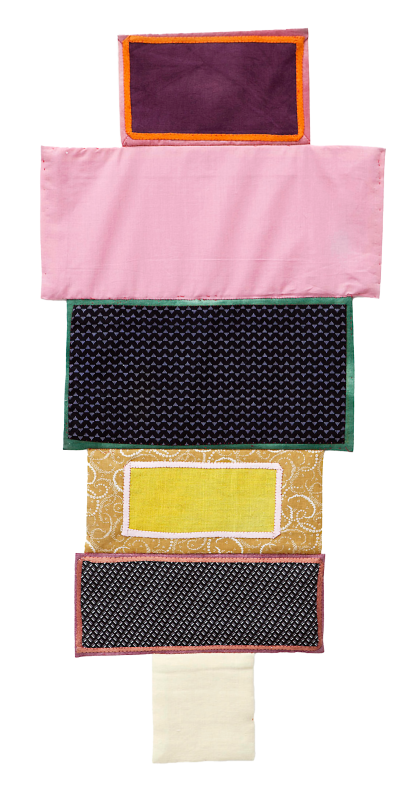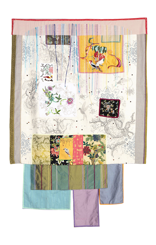 Embroidery, charcoal drawing, ribbons on canvas